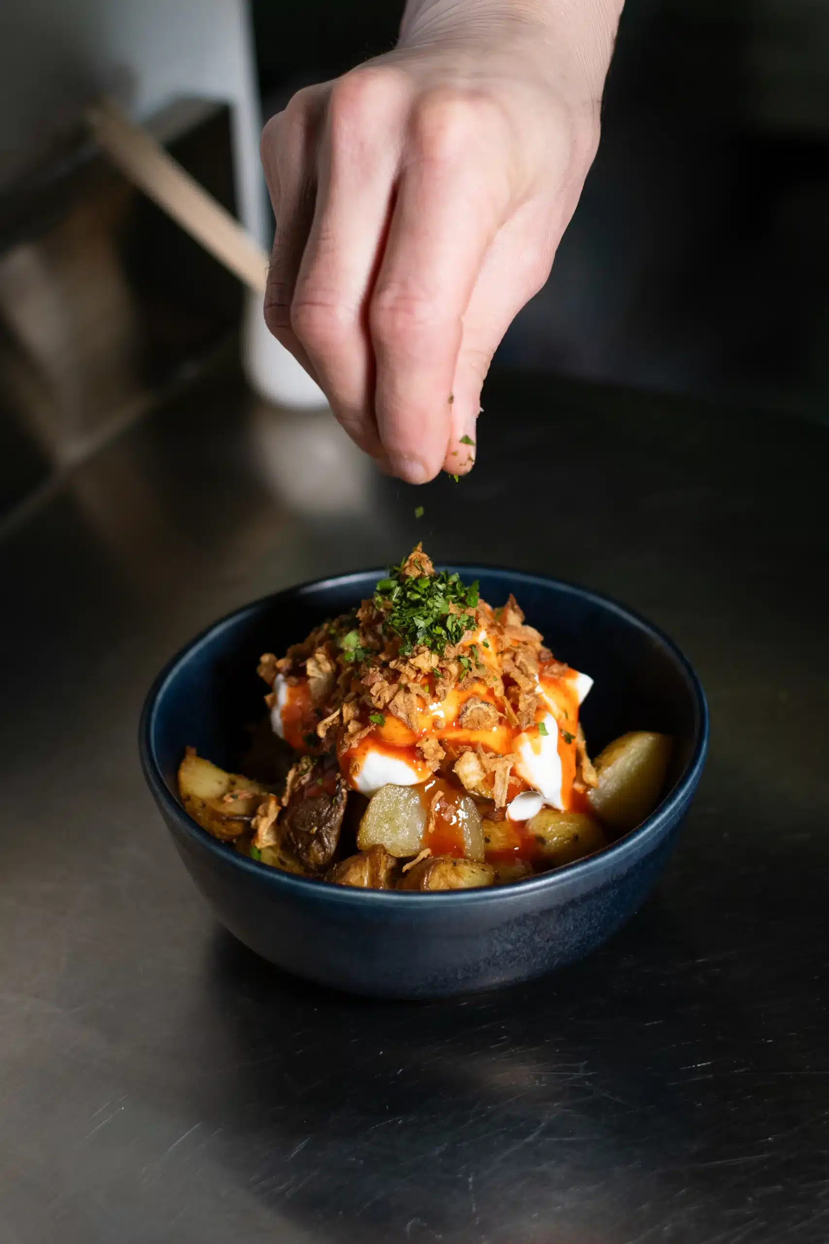 Cazuelita de patatas y champiñones trufados, queso derretido, 1 huevo pochado y Jamón Ibérico. Servido con pan tostado