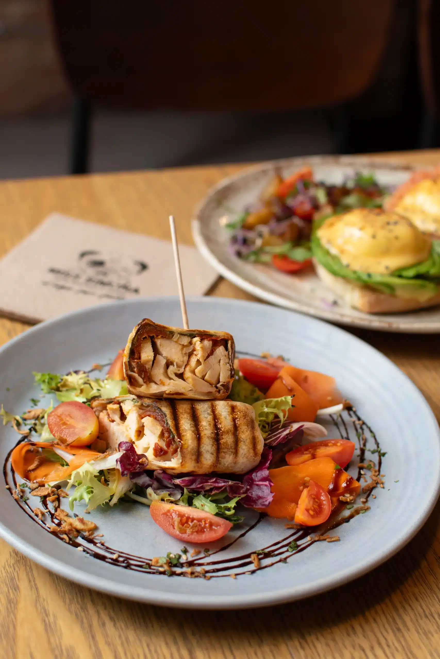 Pollo asado, queso crema, espinacas frescas, tomate seco, cebolla caramelizada y salsa de mostaza y miel. Todo envuelto en un panqueque de trigo tostado a la parrilla. Servido con ensalada.
